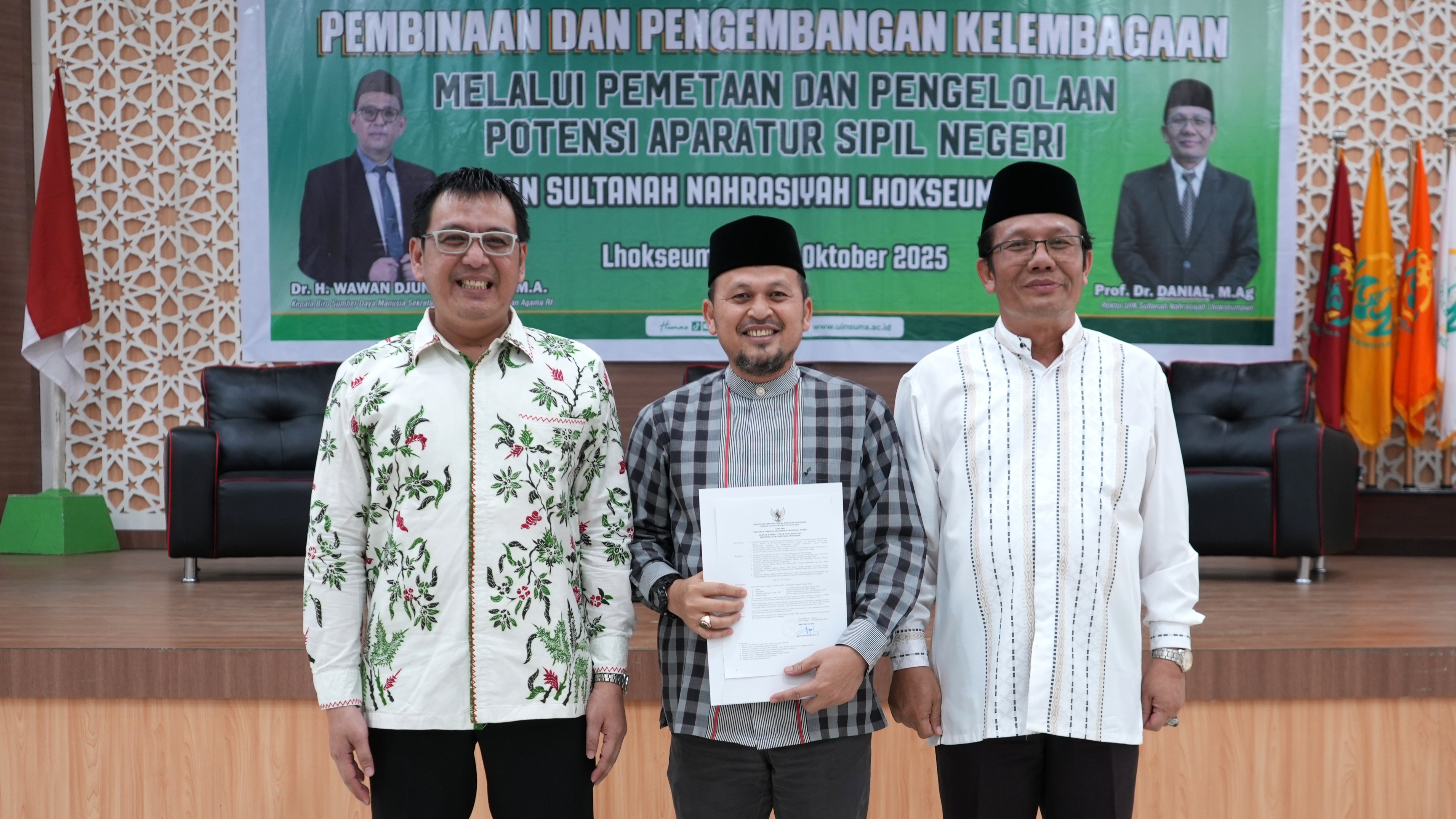 Penyerahan SK tersebut dilakukan oleh Kepala Biro Sumber Daya Manusia (SDM) Sekretariat Jenderal Kementerian Agama RI, Dr. Wawan Djunaedi, S.Ag., M.A, didampingi Rektor UIN SUNA Lhokseumawe, Prof. Dr. Danial, M.Ag dan disaksikan oleh seluruh hadirin, digelar di Aula Gedung Rektorat, Jumat (31/10/2025).