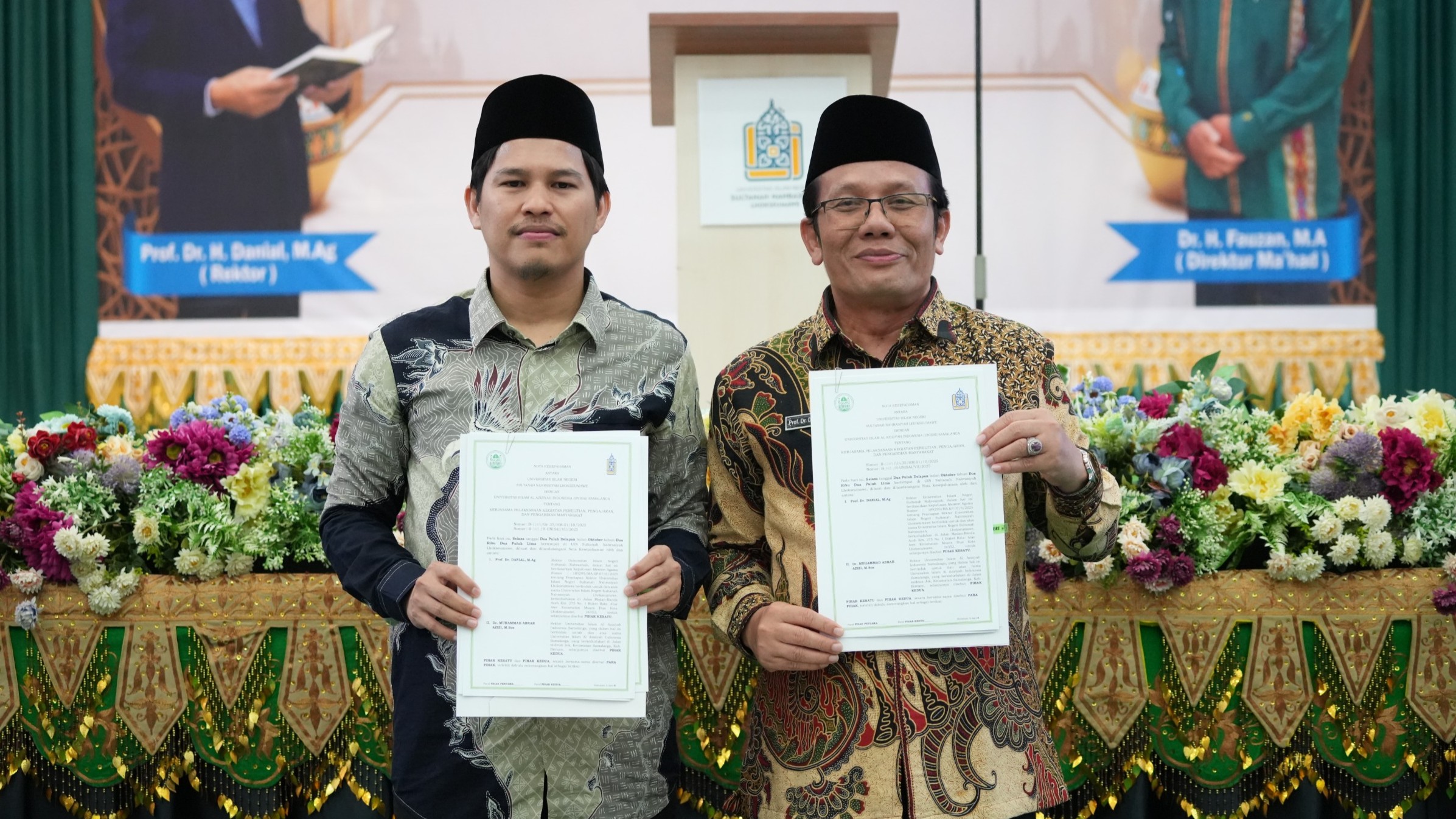 www.uinsuna.ac.id – Universitas Islam Negeri (UIN) Sultanah Nahrasiyah Lhokseumawe menjalin kerja sama dengan Universitas Islam Al-Aziziyah Indonesia (UNISAI) Samalanga. Penandatanganan naskah nota kesepahaman (MoU) dilakukan oleh Rektor UIN Sultanah Nahrasiyah Lhokseumawe, Prof. Dr. Danial, M.Ag, dan Rektor UNISAI, Dr. Tgk. Muhammad Abrar Azizi, M.Sos, dalam rangkaian kegiatan Expo Kemandirian Pesantren di kampus UIN SUNA, Selasa (28/10/2025).
